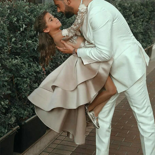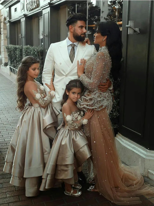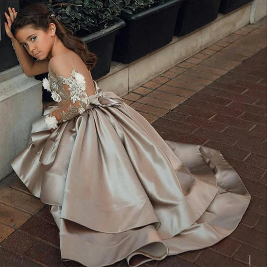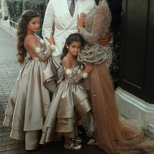 High Low Flower Girls Dresses With Long Sleeve Sweep Train Pageant Birthday Ball Gown Pageant Dresses For Girls
