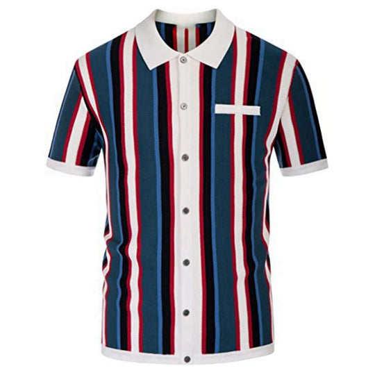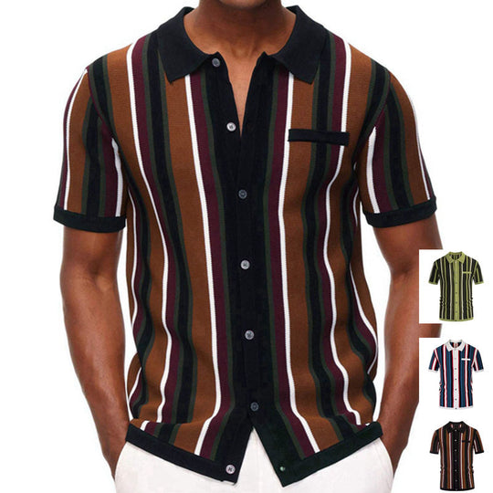 Polo Collar Stripes Casual Knitted T-shirt Short Sleeve